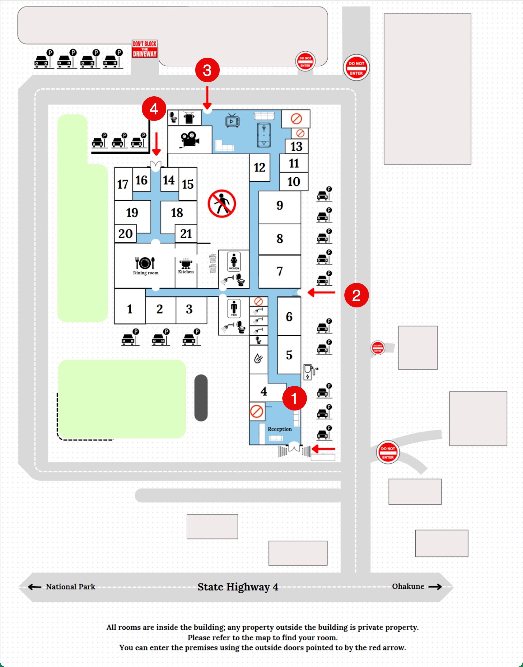 External Access Doors 1 =. Reception door (Main Entry) 2 = Side Entry 3 = Games Room Entry 4 = Kitchen Side Door Entry